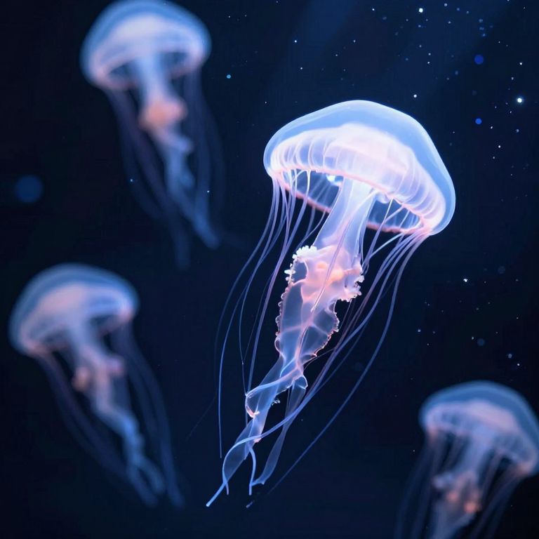 Translucent, ethereal jellyfish float serenely in a cosmic void, their luminous bodies pulsating with radiant energy against a backdrop of celestial light beams and distant star-like specks.