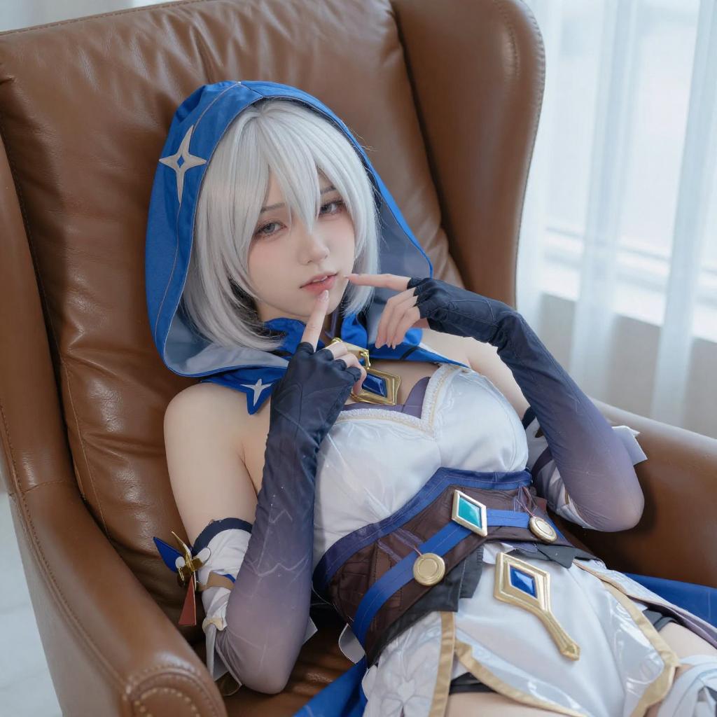 Digital artwork of a nude, white-haired anime woman with blue and gold armor pieces, kneeling on a reflective black surface. She has pale skin, small breasts, and is surrounded by glowing white flowers and blue ribbons against a dark lattice background. Her expression is neutral, and her pose is provocative.