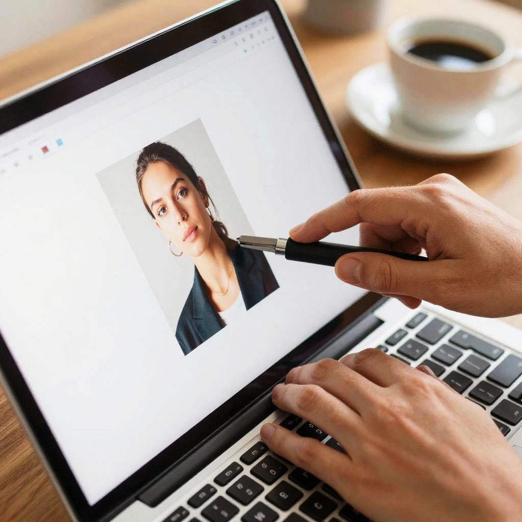 Close-up of a user's hands working on a free transparent background maker on a laptop, detailed view of the precise cutting tool removing background from a portrait photo, warm environment with coffee cup and creative workspace details.