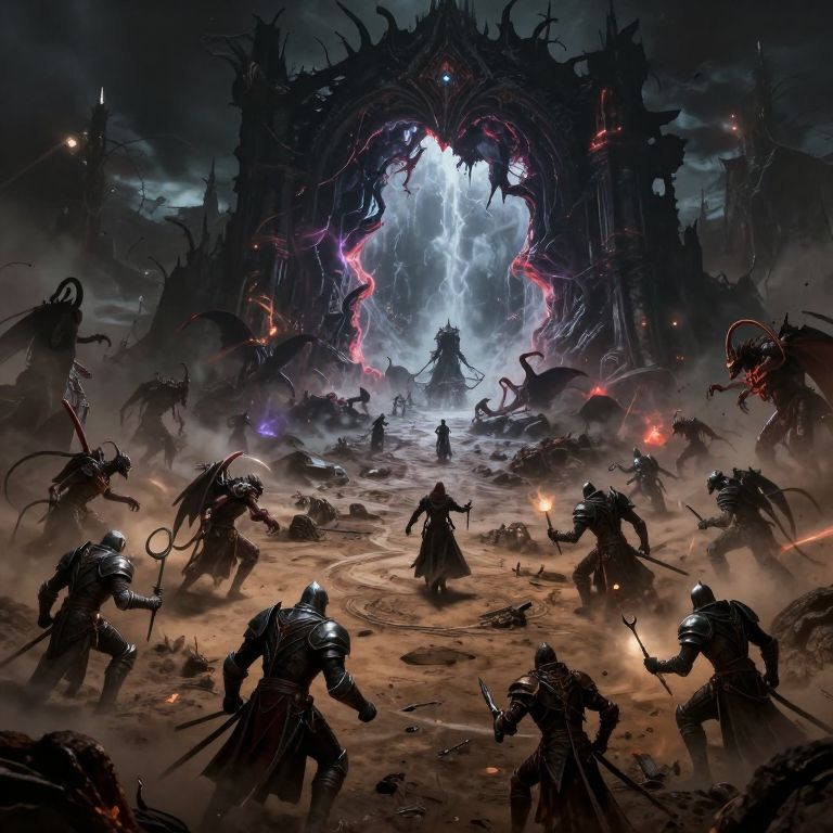 Digital artwork: Dark, armored horned figure with glowing red sun behind, standing on rocky ledge, surrounded by blue-lit, shadowy soldiers,