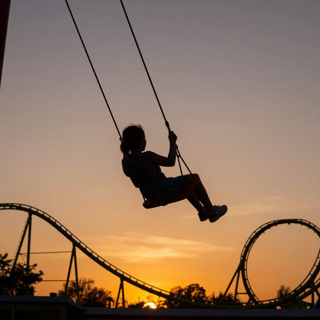 Silhouetted child on swing, sunset background, roller coaster tracks, vibrant orange-yellow sky, darkening horizon, serene evening, playful atmosphere.