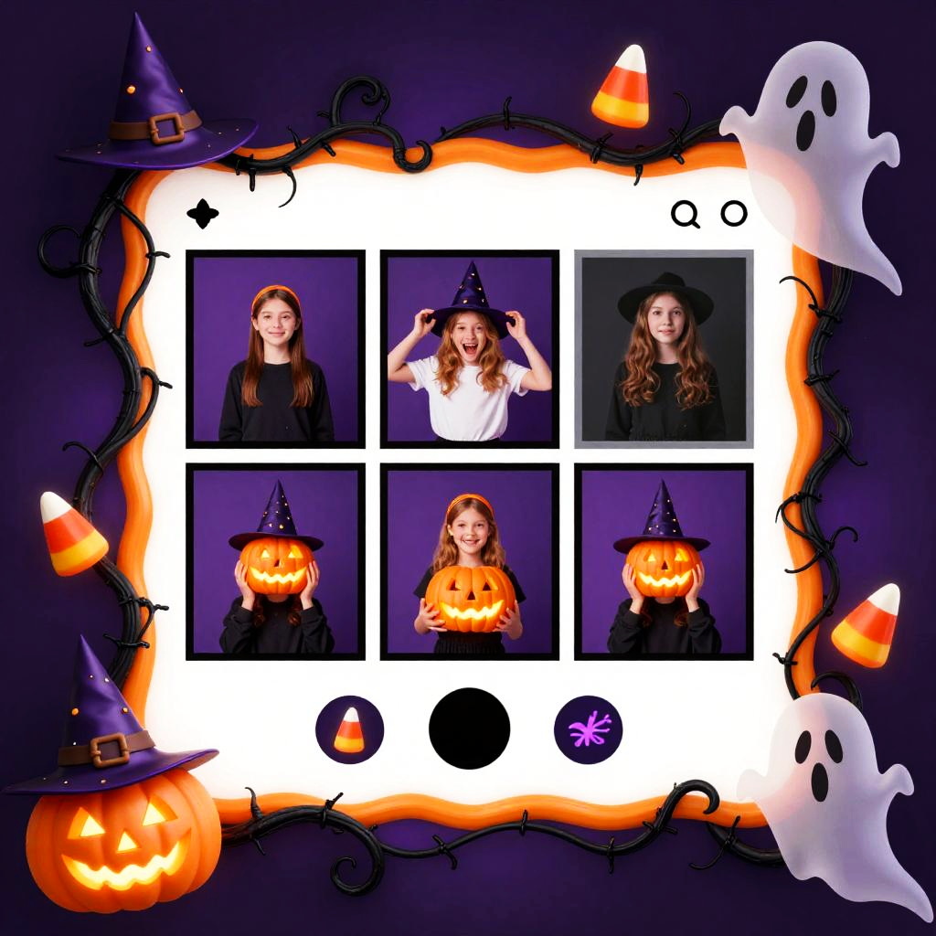 Halloween photo editor online free, creative workspace with a spooky theme, featuring a digital canvas framed by twisting black vines, ghostly overlays, witch hats, and candy corn borders; user interface elements glowing with neon orange and purple hues