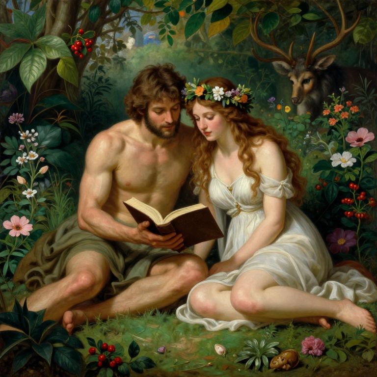In this captivating 1800s painting, Adam and Eve are depicted in the Garden of Eden, engrossed in the act of reading the Bible. The couple, Adam with his muscular torso and Eve with her flowing, wavy hair adorned with a floral crown, sit closely together amidst lush, verdant foliage. The vibrant green leaves and colorful flowers create a rich tapestry of textures and colors, with the red berries adding a striking contrast. The painting's composition is balanced, with the figures centrally positioned, surrounded by an array of plants that frame their interaction. In the background, a mysterious figure with antlers peers out, adding an element of intrigue to the scene. The overall atmosphere is one of serene beauty and ancient wisdom, as the couple appears to be in a state of contemplation and learning.