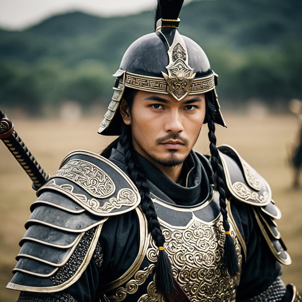 Fancy black costume, male focus, shorts, black hair, armor, blurry background, hat, outdoors, 1boy, solo focus, shoulder armor, blurry, full body, boots, black shorts, standing