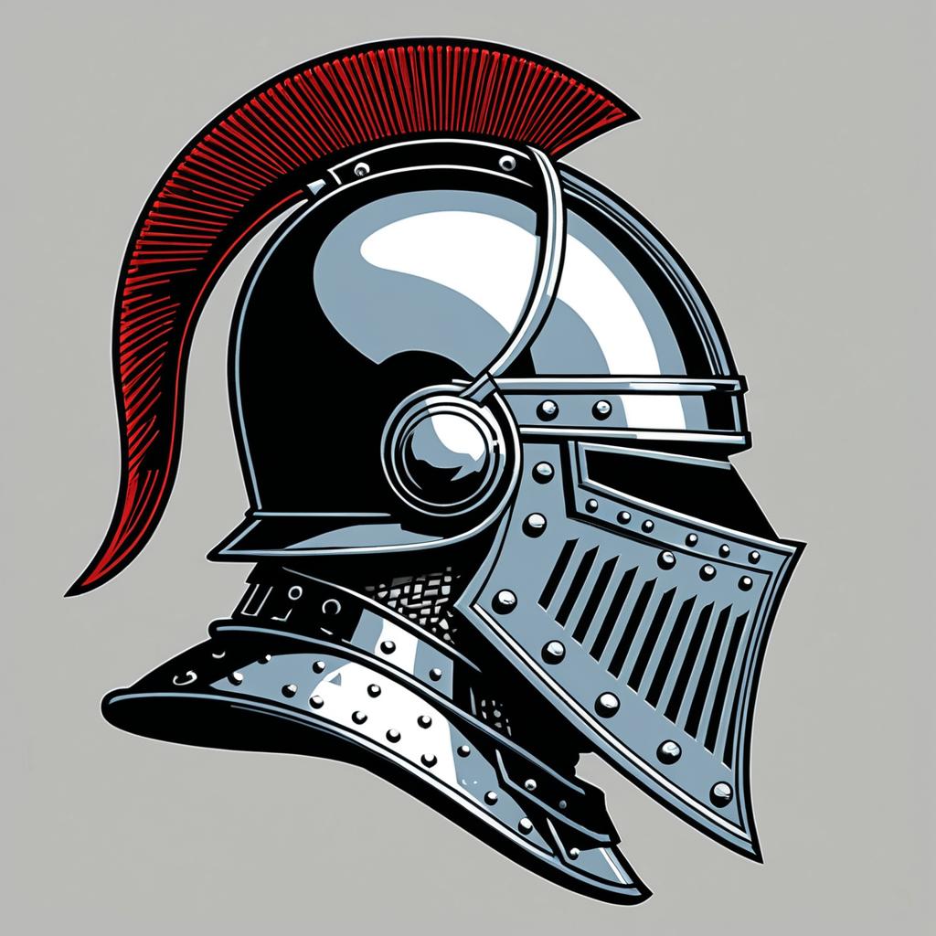 Design coin of a majestic knight, profile of head, steel helmet, armet helmet type, medieval catholic style, stainless glass background in red and blue, silver and black, inking, metallic, vector style, pixel art, less detail, high quality,