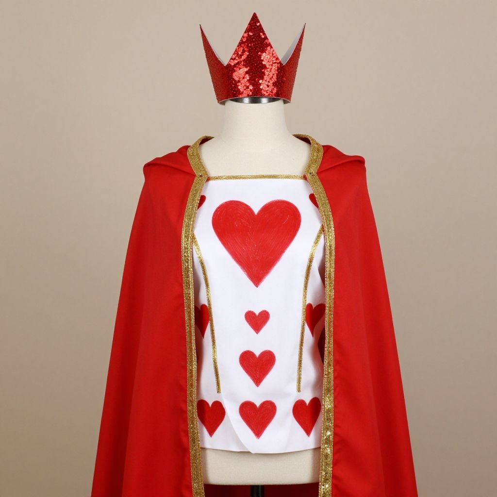 DIY king of hearts costume, creative homemade royal attire with bold reds and whites, hand-painted heart symbols on vest and cape, gold trimming accents, lightweight crown crafted from paper and glitter, photographed on a mannequin against a neutral background for a costume tutorial