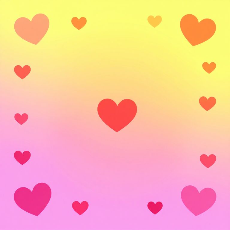 Digital illustration of various-sized hearts in red, pink, and orange hues, scattered on a gradient yellow to pink background.