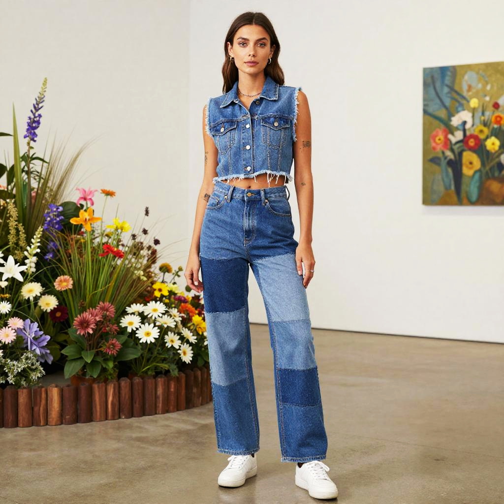 A lean woman in casual streetwear, featuring a cropped denim vest with a frayed hem and high-waisted patchwork jeans in various shades of blue, paired with white sneakers. She has minimal jewelry, including a delicate chain necklace and stud earrings, along with tattoos on her arms. Set against a vibrant flower garden in a gallery, captured in a vertical inc visual style. Sexy. Pretty face and beutiful eyes