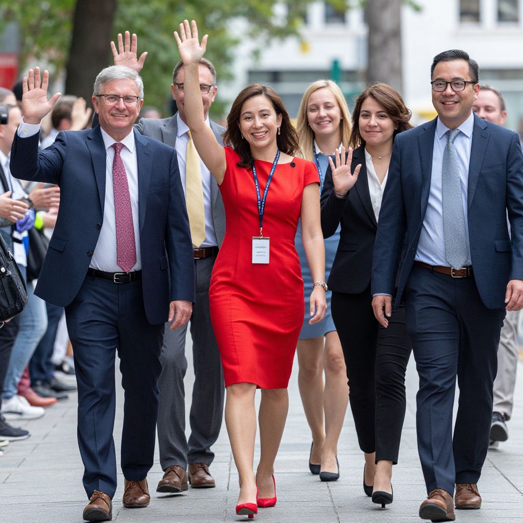 Group of smiling individuals walking together on a city street, led by a woman in a vibrant red dress and lanyard, with others dressed in business attire following closely behind, all waving and engaging with the crowd.