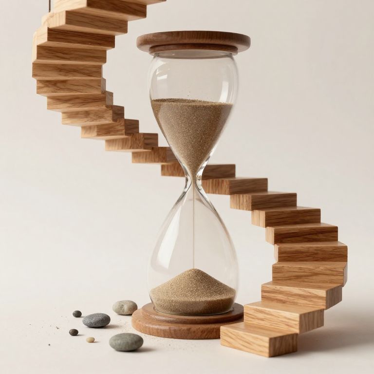 Spiraling wooden steps ascend and descend around a central hourglass, with sand trickling through its narrow neck as scattered pebbles lie below, symbolizing the passage and potential reversal of time.