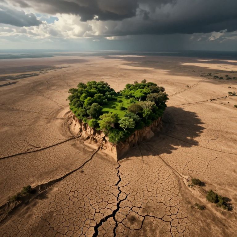The image depicts a surreal, post-apocalyptic landscape reminiscent of a planet after a catastrophic event. The terrain is a vast expanse of cracked, brown earth, with intricate, web-like patterns etched into the surface, suggesting erosion or the aftermath of a massive disaster. In the center of this desolate landscape, a small, verdant island stands as a stark contrast to the surrounding barrenness. The island is lush with greenery, including trees and bushes, creating a heart-shaped formation that is both a focal point and a symbol of resilience amidst the desolation. The sky above is a mix of dark, ominous clouds and patches of light, adding to the dramatic and otherworldly atmosphere of the scene. The overall composition is dynamic, with the heart-shaped island positioned centrally, drawing the viewer's eye through the web-like patterns and across the vast, textured expanse of the earth.