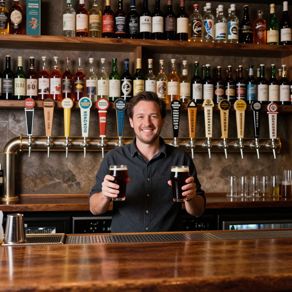 Photograph of a smiling bartender with short brown hair, wearing a black button-up shirt, holding two beers, behind a wooden bar with a variety of