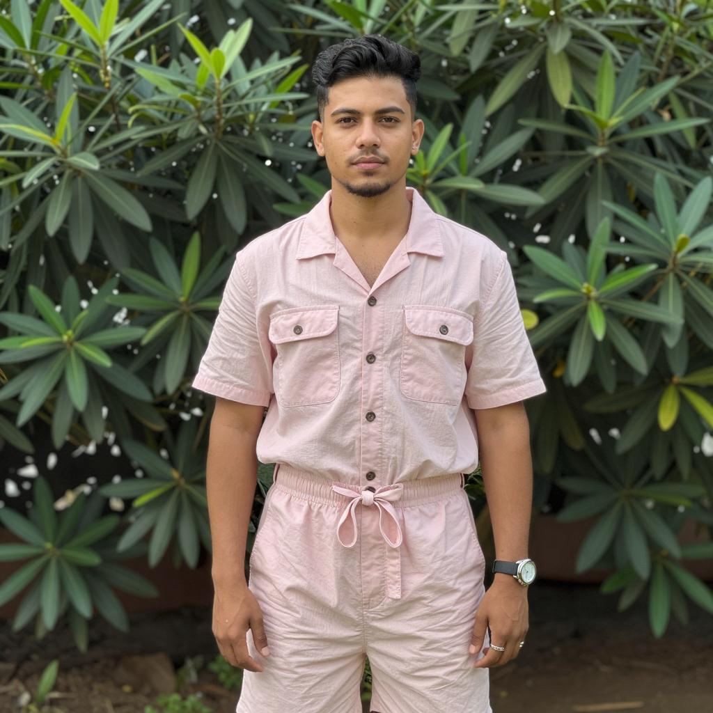 A young man standing outdoors in front of dense green bushes. He is wearing a light pink romper with short sleeves, buttoned front, and matching shorts. The man has a neatly styled haircut and is accessorized with a wristwatch and a ring. The setting appears to be a garden or natural outdoor area during daylight.