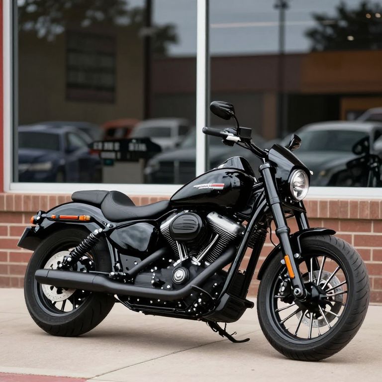 Black 2019 Harley-Davidson Low Rider® motorcycle parked outside a showroom window in Knoxville, Tennessee. This cruiser motorcycle features a sleek design, chrome engine accents, dual rear shocks, and a bold black finish with reflective surfaces.