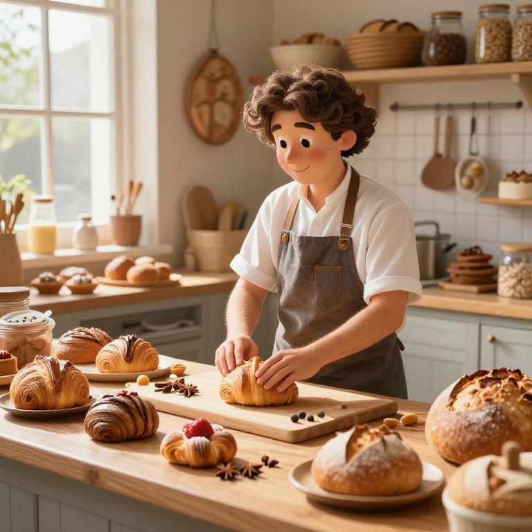 Photograph of a smiling, curly-haired baker in a white shirt and gray apron, assembling croissants on a wooden kitchen counter. Sunlit