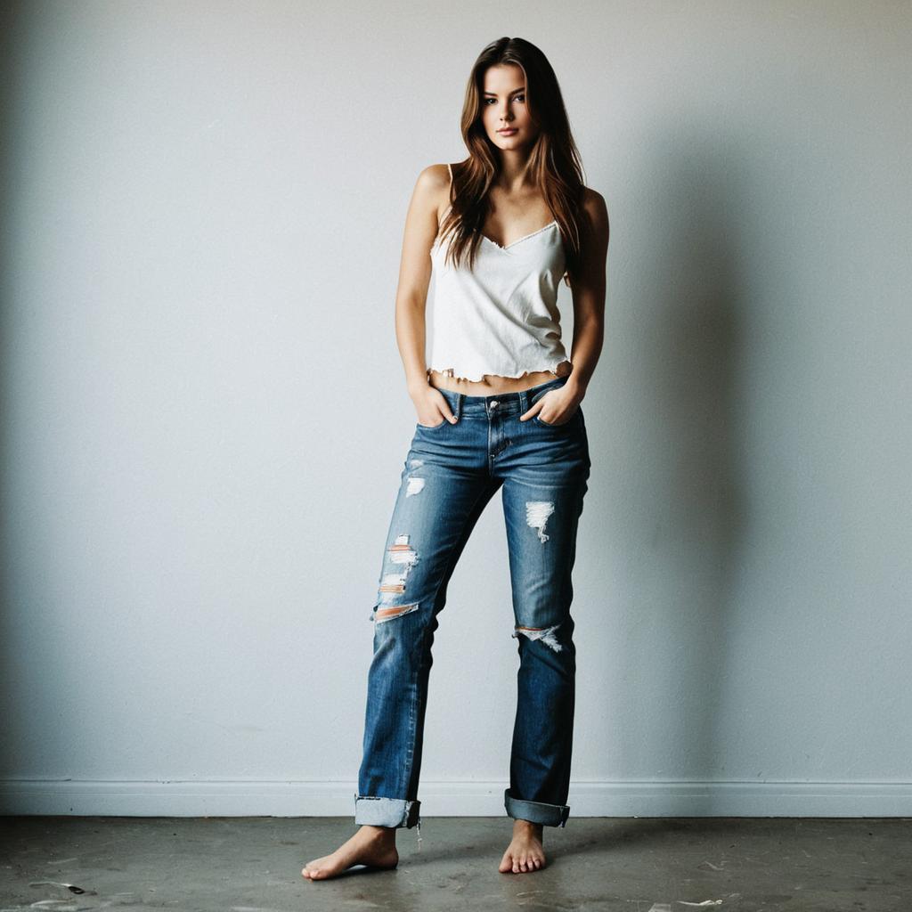 High end jeans,1girl, denim, solo, jeans, pants, torn jeans, torn pants, barefoot, brown hair, realistic, torn clothes, long hair, standing, camisole, full body