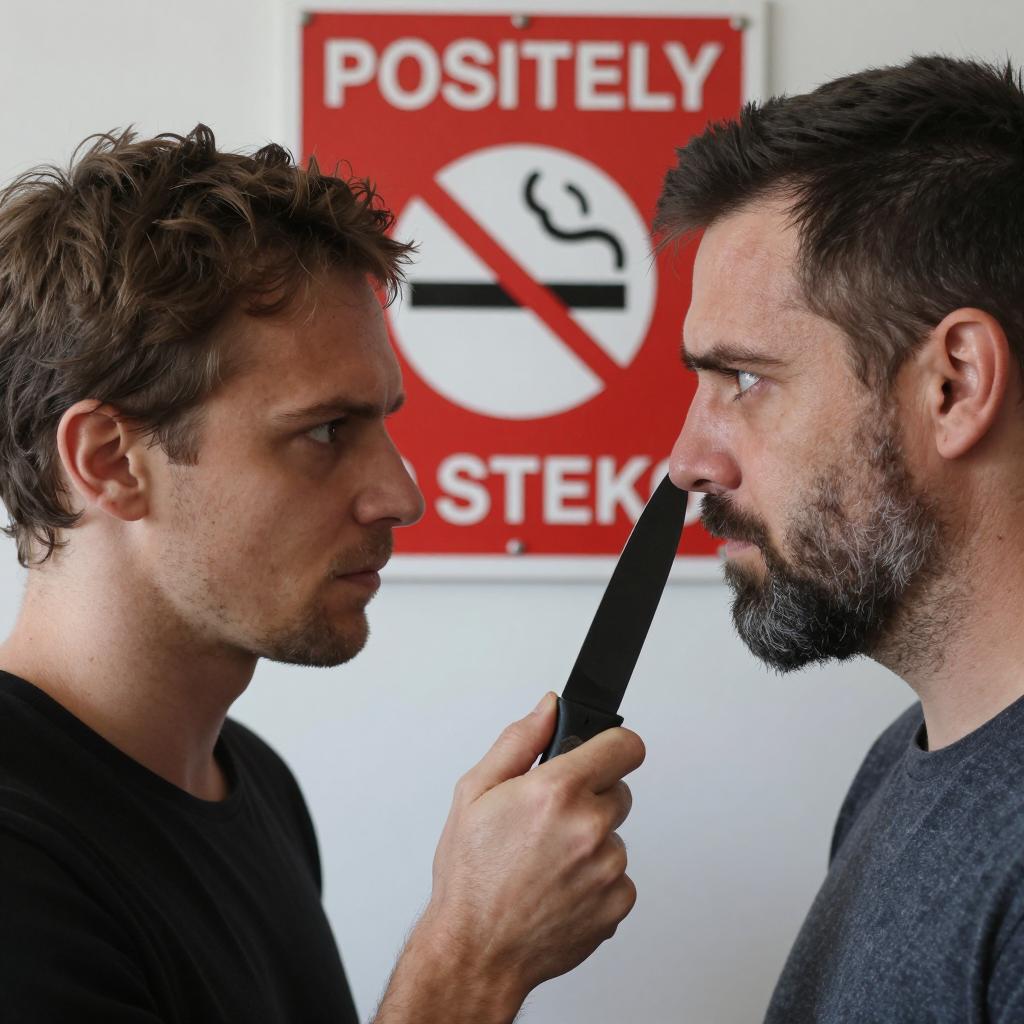 Two men in close-up, the left man holding a black knife pointed at the right man's face, red "Positively no smoking" sign in background. Left man has short brown hair, black shirt, intense expression. Right man has short dark hair, gray beard, tense expression.