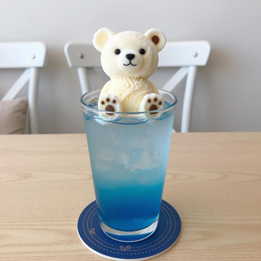 Glass of blue iced drink with a white bear-shaped ice cream on top. Bear has small black ears, brown nose, and paw prints. Blue decorative coaster under glass. Light wooden table. White chair with beige cushion in background.