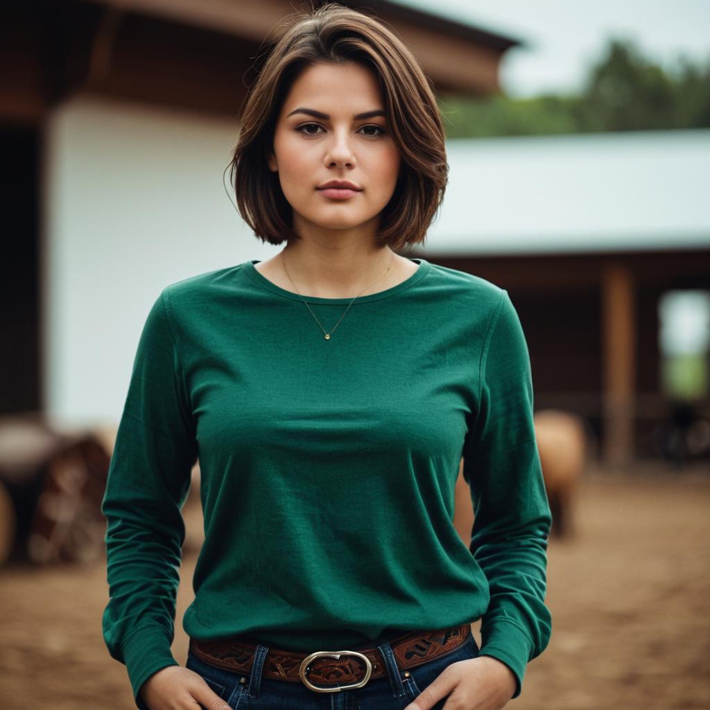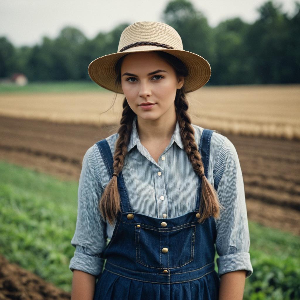 Farmer outfit girl ,1girl, hat, shirt, overalls, realistic, blurry, blurry background, looking at viewer, solo, blue shirt, sleeves rolled up, straw hat, collared shirt, outdoors, holding, cowboy hat, pants, black hair, long hair, closed mouth, standing