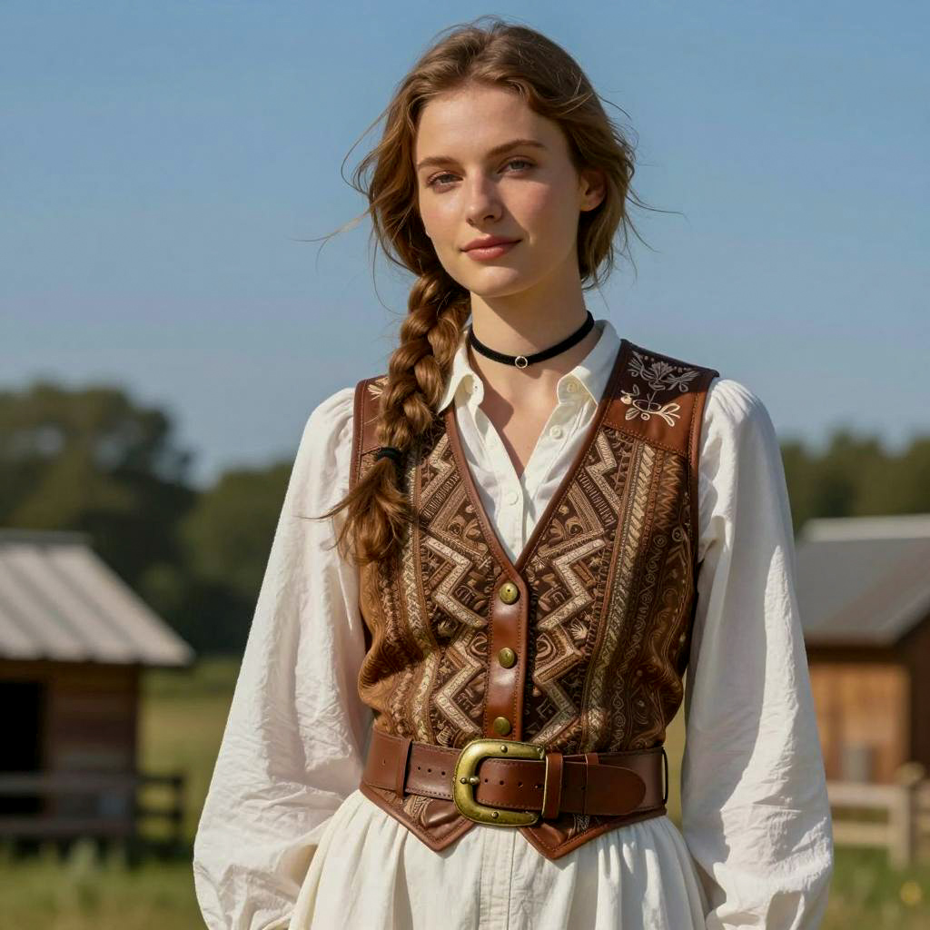 A young woman stands confidently in a rural setting during golden hour, wearing denim overalls and a red plaid shirt. The rustic wooden barn and lush green fields in the background highlight a serene countryside atmosphere.
