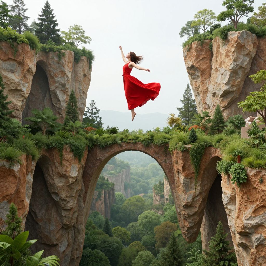 Photograph-style digital illustration of a woman with long black hair and fair skin, mid-air, wearing a flowing red dress, leaping between two towering, rocky cliffs with lush greenery. The cliffs have an arched natural bridge covered in moss and small trees. The background showcases a dense, verdant forest. The image exudes a fantastical, fairy-tale vibe with vibrant colors and dynamic composition. The woman's dress billows dramatically, contrasting with the solid, rugged cliffs.