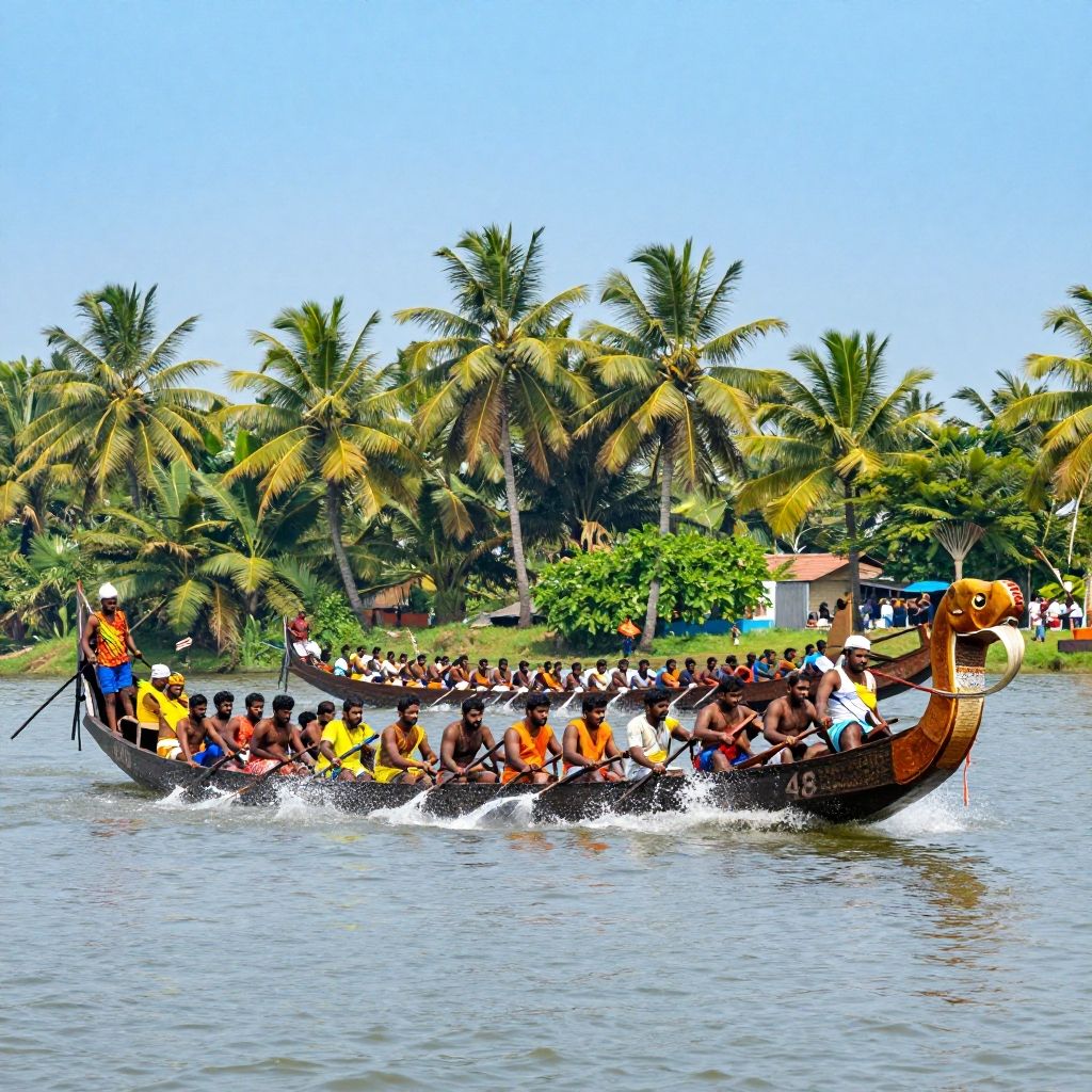 Malayalam culture boat race on backwaters, long snake boats filled with rowers in bright clothing, water splashing, tropical palm trees lining the banks under clear blue sky