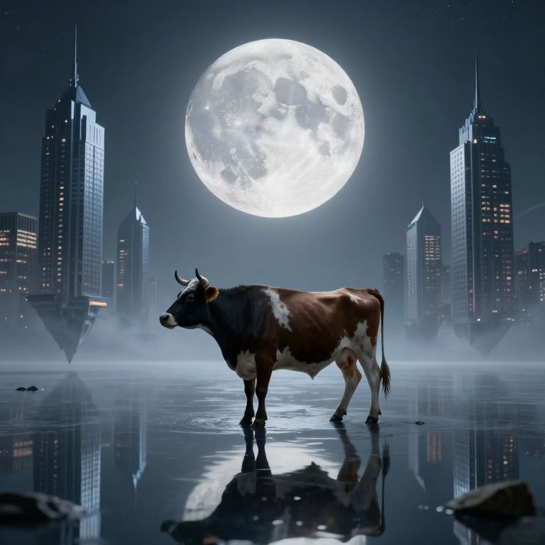 In a surreal dreamscape where moonlit skyscrapers float above a mirrored horizon, a solitary cow stands as a symbol of quiet resilience, embodying the eternal dance between creation and dissolution.