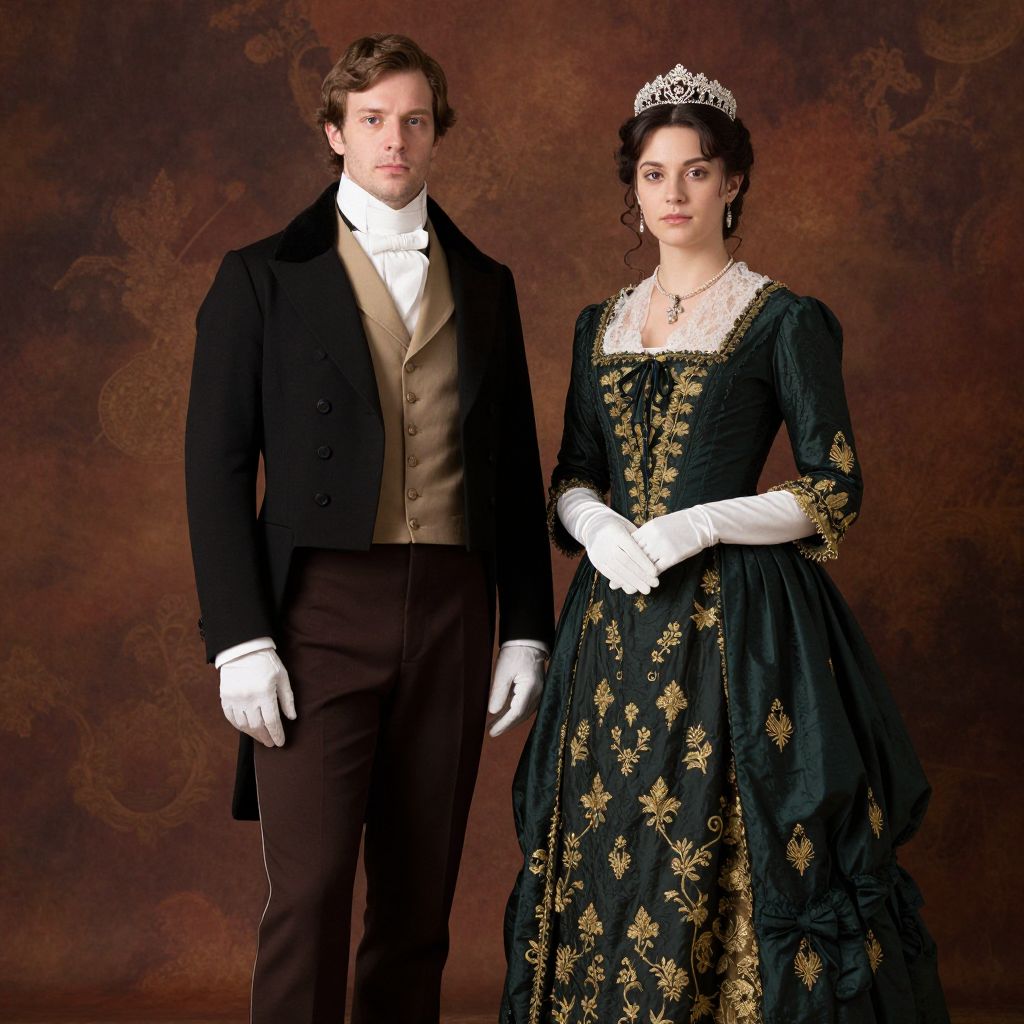 Elegantly dressed individuals stand side by side in Victorian-era attire, featuring a man in a black frock coat over a tan vest and white cravat, paired with brown trousers, while a woman beside him wears a dark green gown adorned with gold embroidery, a lace collar, white gloves, and a tiara, set against a richly textured backdrop.