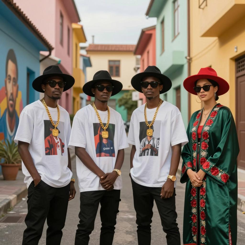 A stylish group of four young adults standing in a vibrant urban alley lined with brightly colored buildings and large portrait murals. Three individuals wear oversized white shirts adorned with graphic prints and gold chains, paired with black sunglasses and hats. The fourth wears a green silk robe with red floral embellishments and a red hat. The scene is set during twilight, creating a striking contrast between the colorful architecture and their modern, eclectic fashion.