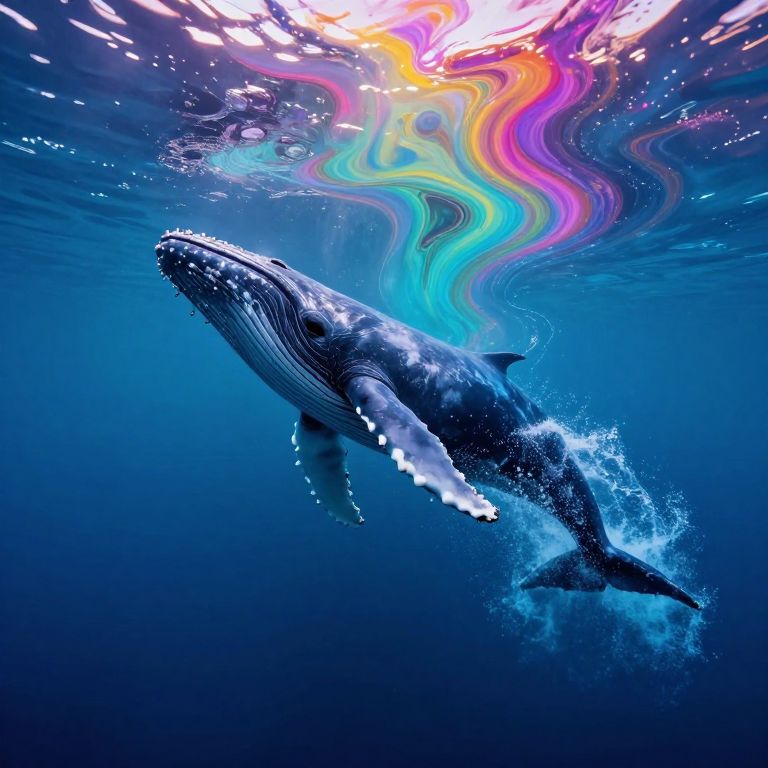 Imagine a surreal underwater landscape where vibrant hues swirl like cosmic patterns, merging with ethereal light in an artistic fusion of psychedelic and deep-sea exploration themes. In this mesmerizing scene, a majestic whale breaches the surface from mysterious depths, captured from an unconventional perspective that reveals its powerful momentum and grace as it transforms into the realm of luminescent colors. This awe-inspiring image blends otherworldly beauty with the enigmatic subterranean world, inviting viewers to marvel at nature's grandeur and explore the uncharted territories beneath the ocean's surface.