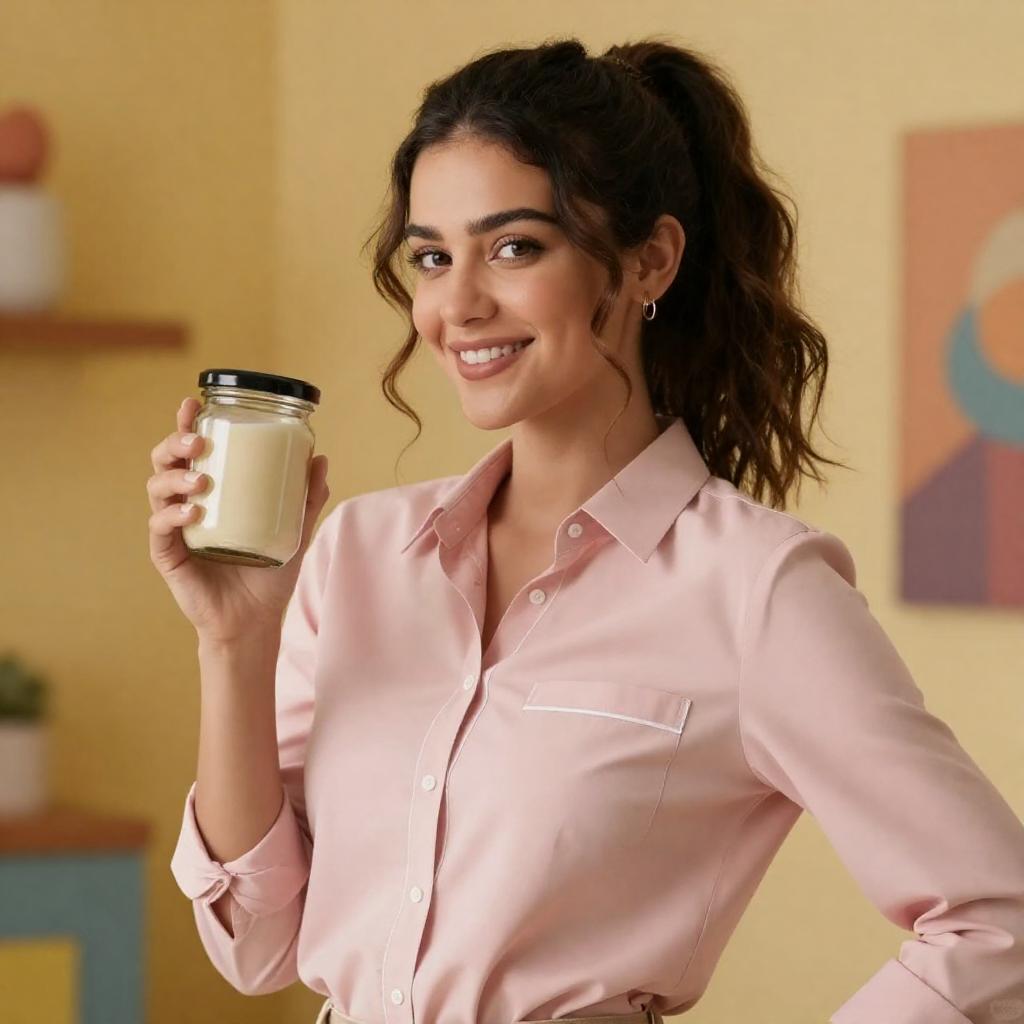 Photograph of a smiling woman with dark, wavy hair in a high ponytail, wearing a pink, button-up shirt with white trim. She holds a glass jar with a black lid in her right hand. The background features warm, yellow lighting and blurred, colorful elements. She stands slightly turned to the right, showcasing her confident pose.