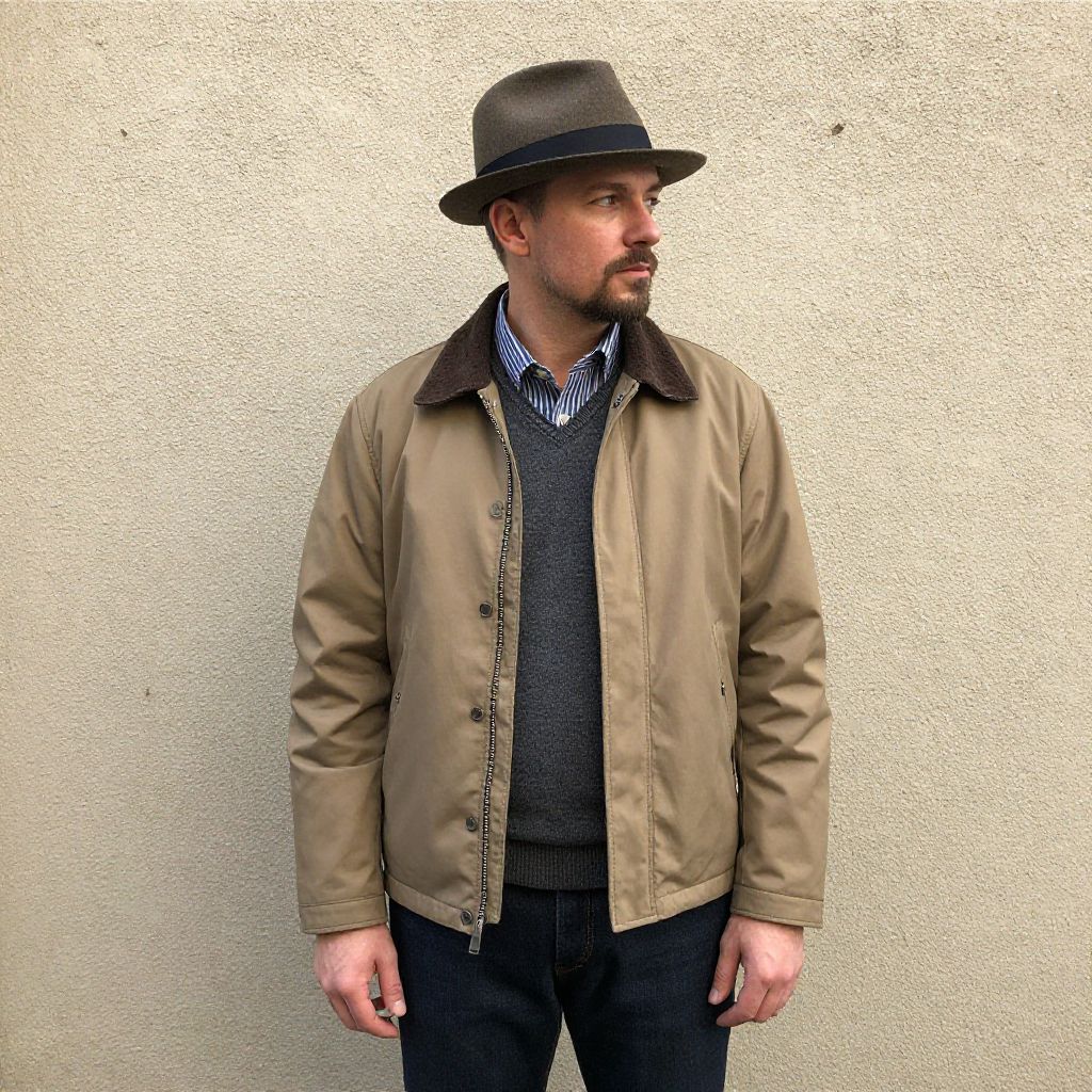 "Vintage Man Style, man in a hat and jacket standing in front of a wall"