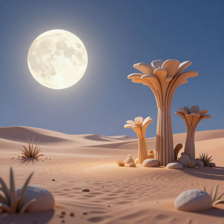A serene 3D-rendered desert landscape bathed in the ethereal glow of a full moon, featuring whimsical stone structures that resemble blooming plants under the enchanting light, evoking a dreamlike, otherworldly atmosphere.