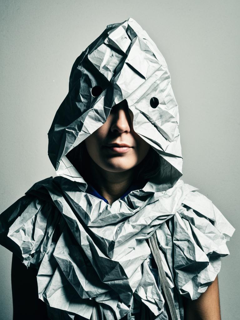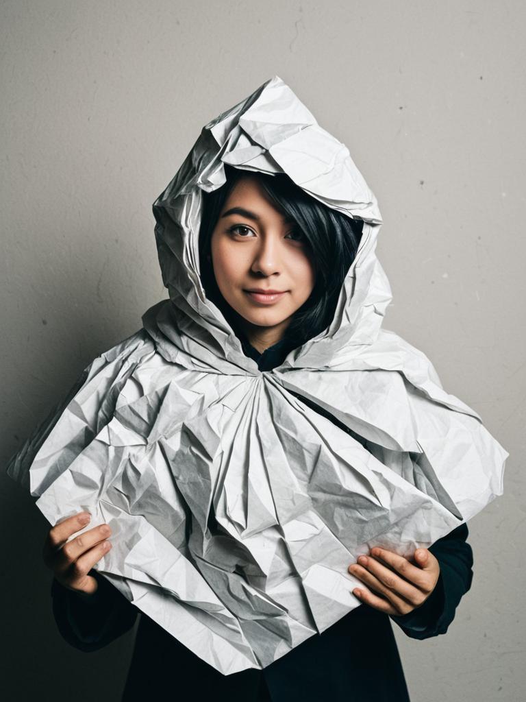 Person in Crumpled Paper Costume, photorealistic humorous cosplay studio portrait
