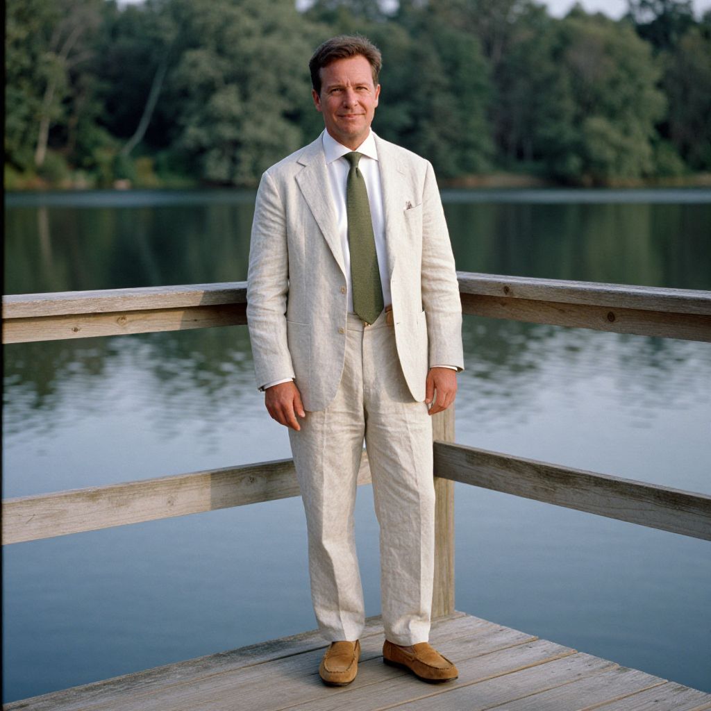 "a man, light beige linen suit, crisp white dress shirt, tan canvas suspenders, suede loafers in camel, solid tie in olive green, tranquil lake, wooden observation deck, lomography analog photo, relaxed smile, soft sunlight filtering through trees. Man has masculine face and piercing eyes"