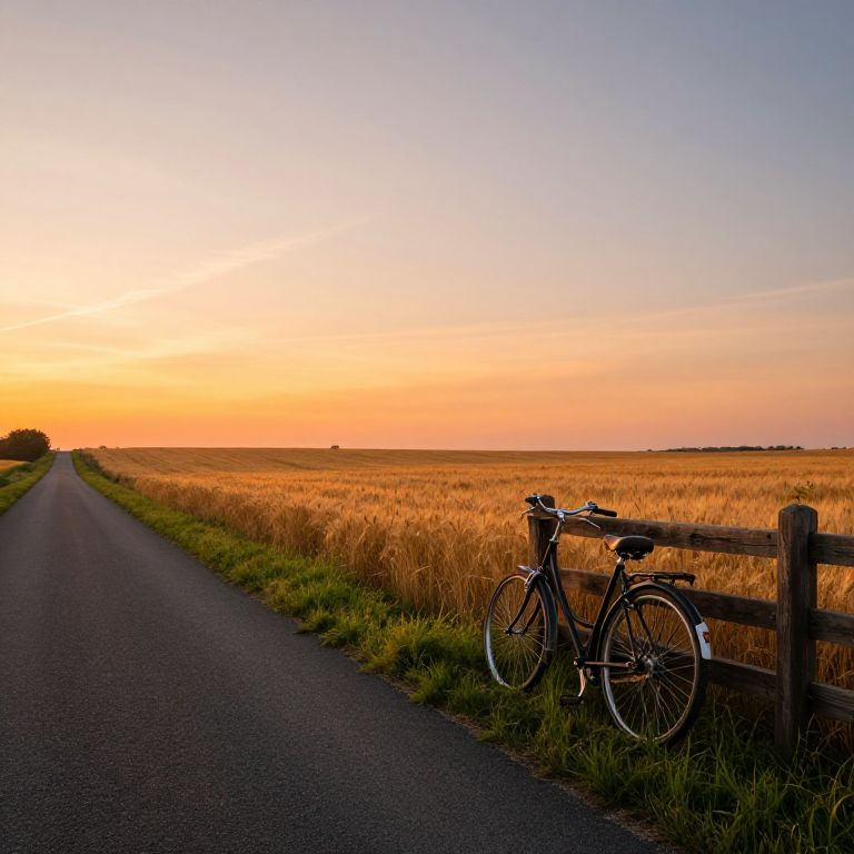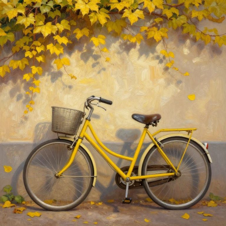 Yello vintage bicycle leaning against a sunlit wall covered in yellow ivy, with warm shadows and a nostalgic atmosphere, painted in impressionist style, rich in yellows and earthy tones.