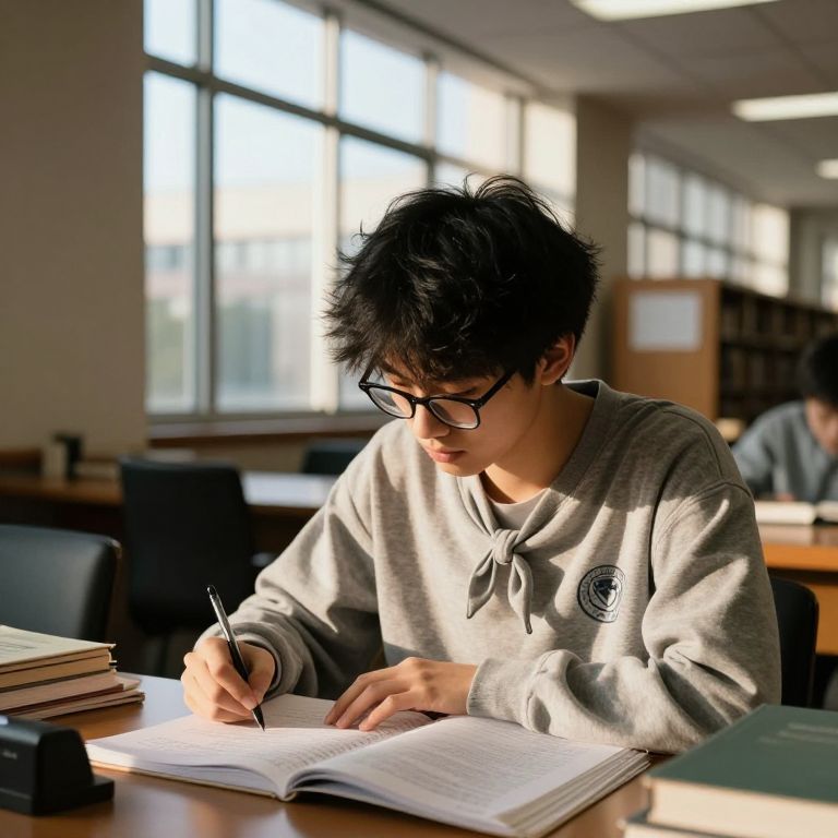 Photograph of a young Asian male with messy black hair, glasses, and grey sweatshirt, writing in an open notebook in a sunlit library.