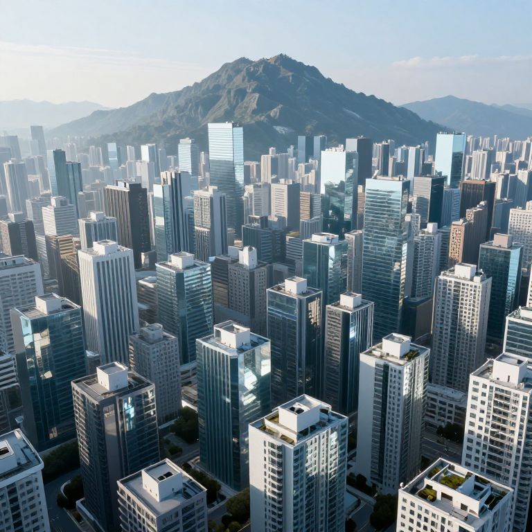 Photograph of a modern urban cityscape featuring a dense cluster of tall, glass-and-steel skyscrapers with reflective surfaces. The buildings vary in height and design, creating a mosaic of white, gray, and blue hues. In the background, a large, forested hill rises under a clear blue sky. The city's grid-like streets are partially visible between the buildings. The image captures the brightness and clarity of daylight, highlighting the sleek, contemporary architecture and the natural contrast of the hill against the urban landscape.
