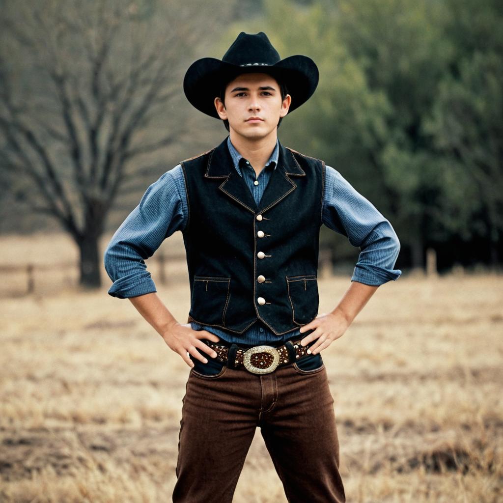 Cowboy chaps costume,1boy, male focus, solo, cowboy hat, hat, cowboy western, belt, shirt, brown belt, looking at viewer, scarf, black hair, gloves, denim, blurry background, realistic, belt buckle, blurry, vest, buckle, jeans, pants, outdoors, brown vest, fringe trim
