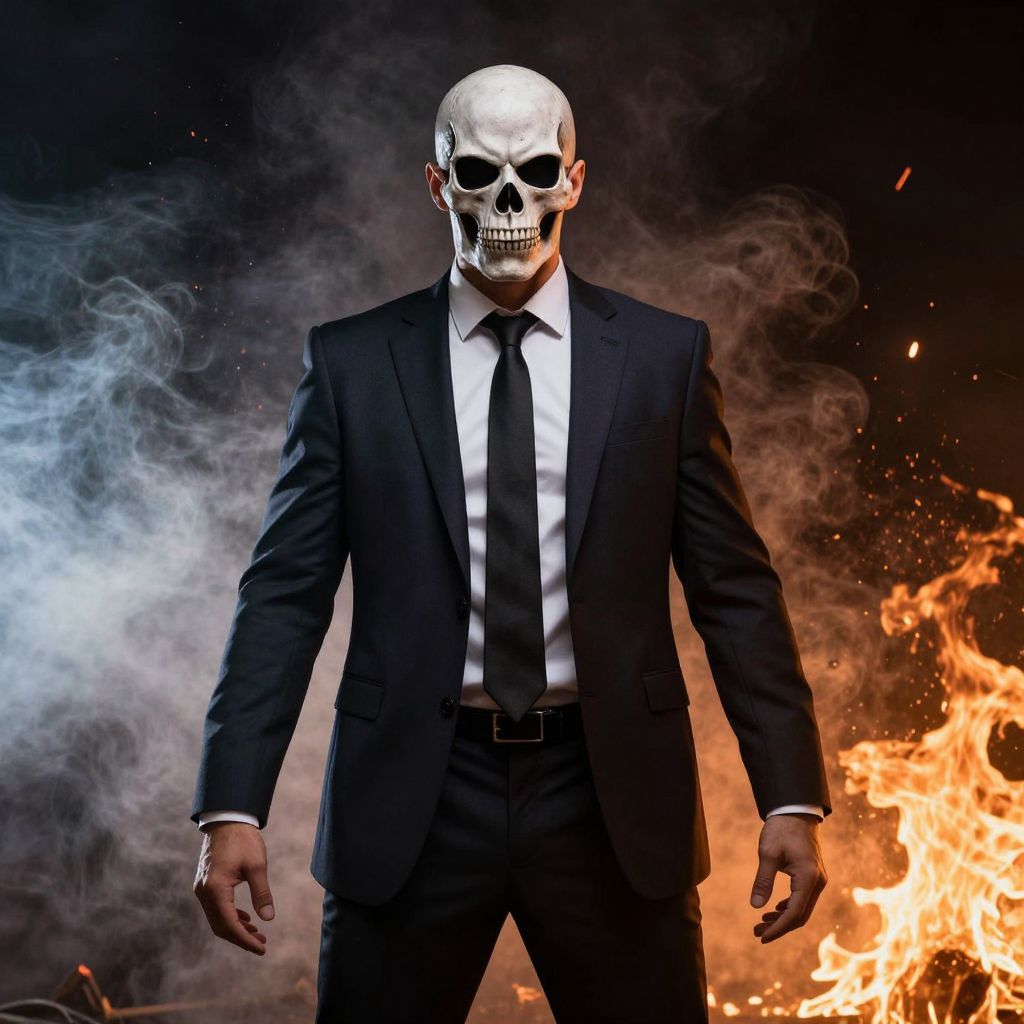 A man in a suit and tie, with a skull-like face, stands in a dramatic, fiery scene with smoke and dynamic lighting, evoking a sense of power and control.