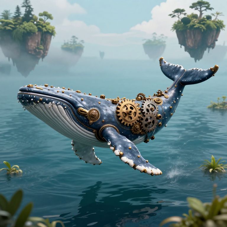 A steampunk whale adorned with intricate gears and cogs glides serenely across the ocean's surface, its mechanical body seamlessly merging with the natural world as it hovers above verdant, floating islands cloaked in mist.