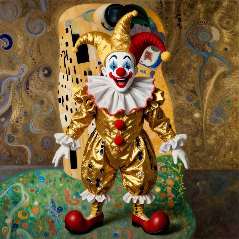 A playful portrait of a jester clown with exaggerated footwear and an infectious grin, this artwork merges the opulent, gold-leafed textures reminiscent of Gustav Klimt's iconic style with abstract landscapes swirling in patterns evocative of Salvador Dali's surrealist visions. The unique aerial perspective, as if viewed through a kaleidoscope, presents the clown from an innovative angle that captivates and intrigues the viewer. This harmonious blend of artistic styles and viewpoints creates a visually enchanting experience, invoking feelings of delight, humor, and curiosity in equal measure, while defying traditional boundaries to offer a one-of-a-kind visual journey.