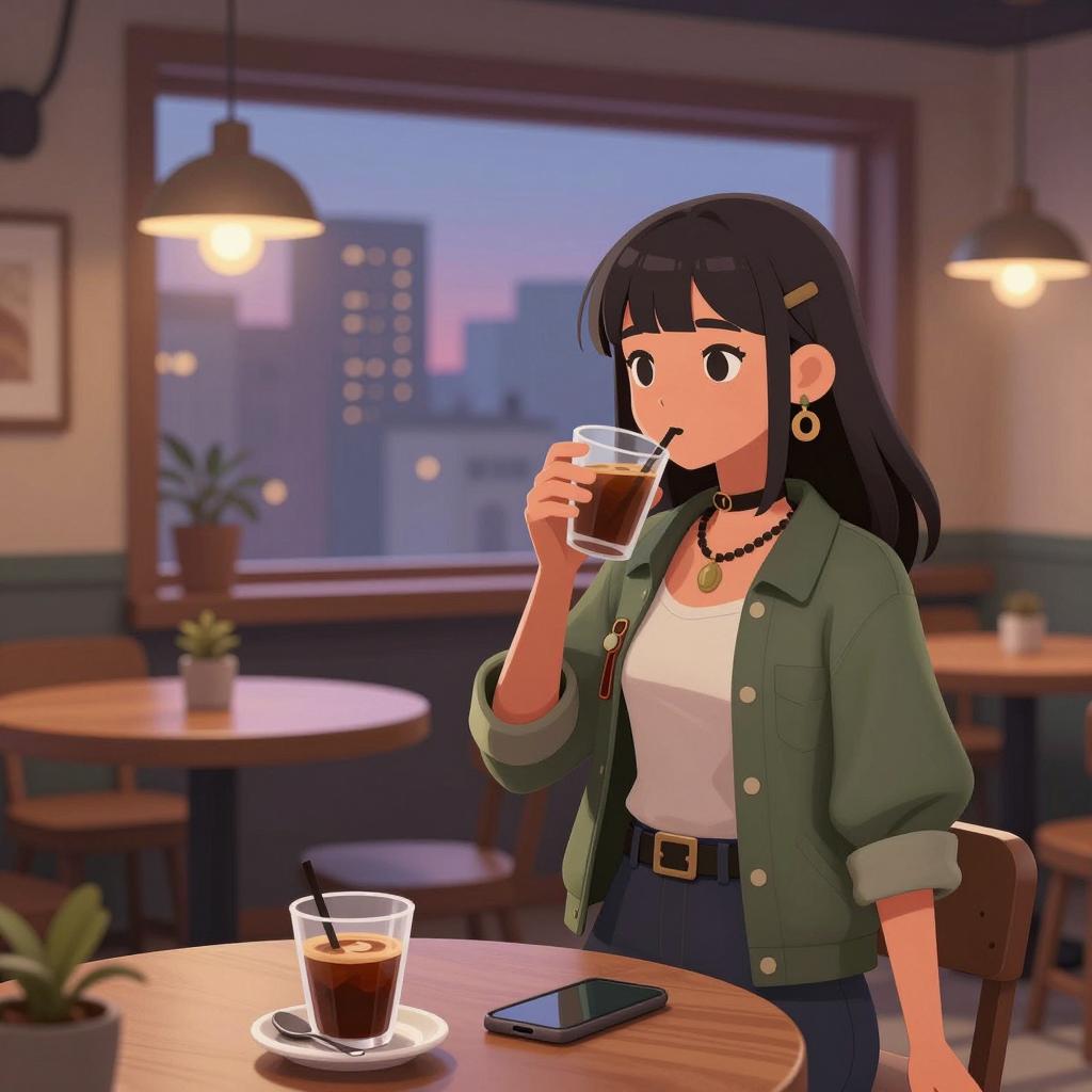 Idea very detailed digital 2d game art, hip urban cafe full of hipsters::1 very detailed digital 2d game art::2 very detailed digital 2d game art, cool oriental girl 20 something standing close to the camera, taking a sip of coffee, looking at the horizon::3,