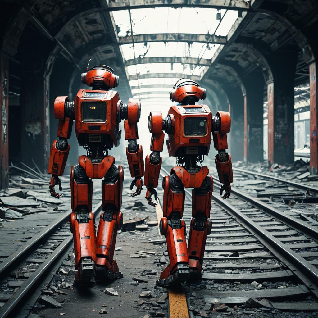 Two humanoid red scavenger robots with rusted patina and scratched sensor panels, walking away from a ruined abandoned subway station, post-apocalyptic wasteland, hyper-photorealism, cinematic lighting, V-Ray and Octane Render