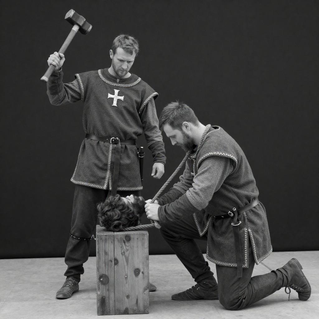 Black-and-white photograph of two men in medieval-style costumes, one standing with a hammer raised, the other kneeling with a rope around the neck of a third person bent over a wooden block. The kneeling man holds the rope, while the standing man looks determined. The background is a dark, ured wall with faint "MAY" letters.
