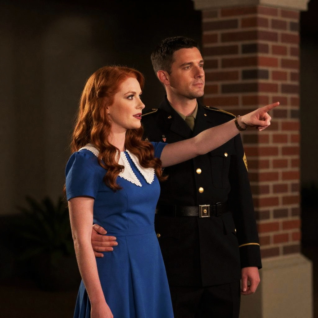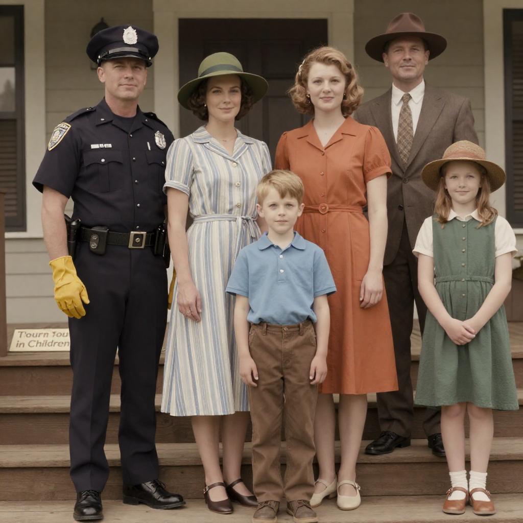 Photograph of a mid-20th-century movie poster. Three police officers in dark uniforms with caps stand in a kitchen. A woman with curly blonde hair, wearing a black dress, stands at the center, holding a plate. Counter with food and dishes in the background. Two officers are on the left, one on the right, facing the woman. The woman's expression is surprised. Kitchen has wooden cabinets and a window with blinds.