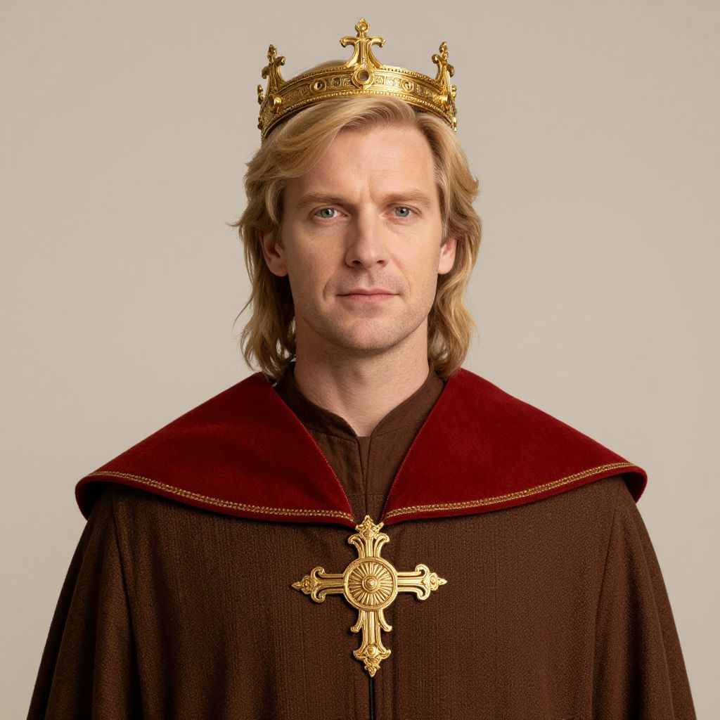 Man with blonde hair and a crown on his head. He is wearing a brown robe with a red collar and a gold emblem on the front.