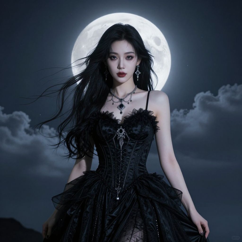 Photograph-style digital art of an Asian woman with long black hair, wearing a black lace dress and jewelry, standing in front of a full moon against