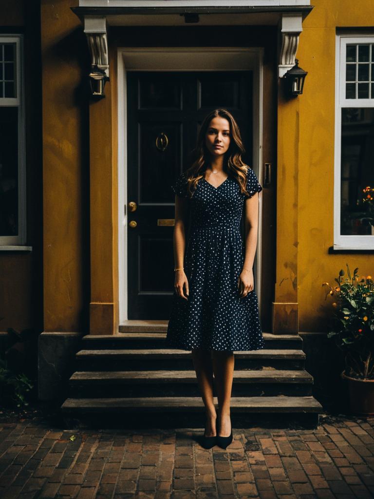 A young woman with light brown hair stands in front of a dark wooden door set in a yellow building. She is wearing a navy blue dress with white polka dots and black pointed shoes, positioned on brick steps with plants visible nearby.