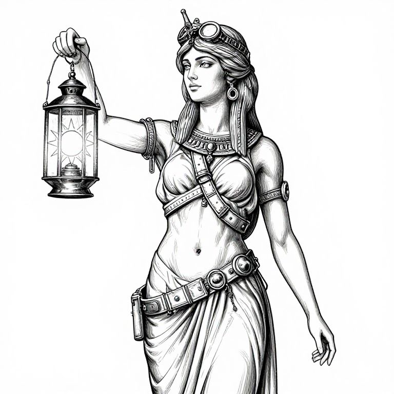 "Steampunk Fashion a black and white line drawing in the style of atalanta fugiens of a statue of the goddess isis holding a lantern containing the sun,"